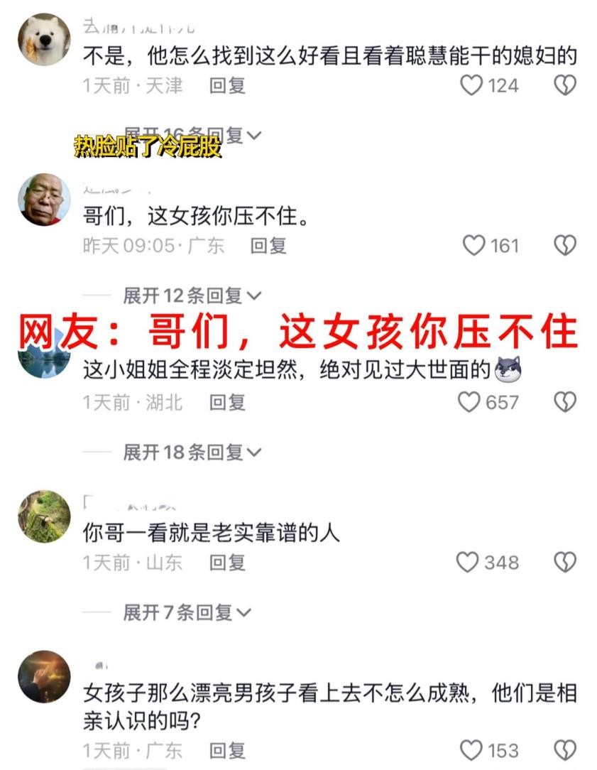 不过当镜头扫过小伙涨红的脸,还是有人担忧:"这颜值差怕是镇不住场,姐以后得随身带降压药吧?"