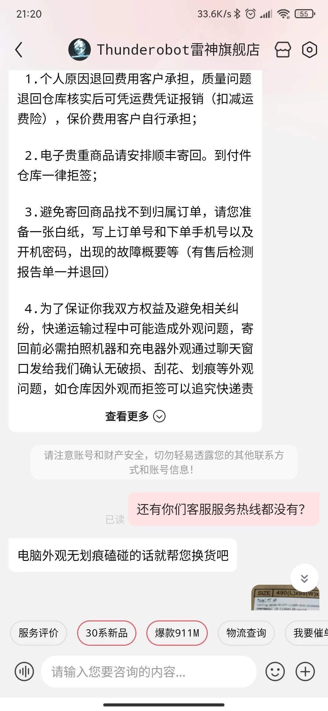 2022年3月7号买的雷神笔记本911MT,3月14号看LOL直播花屏,期间上班没怎么用,准备退货了的,客服说是英特尔驱动的问题调试一下就好了,按着客服的步奏调试好了,就取消了退货,3月17号玩了一局云顶之弈就开始蓝屏,自动关机重启,一直都是蓝屏,重启,找客服无解,要求换货客服说质量没问题,要检测报告是质量问题才给换货,沟通无解,京东客服介入,给换了货,3月23还没后续,,以下是图片。