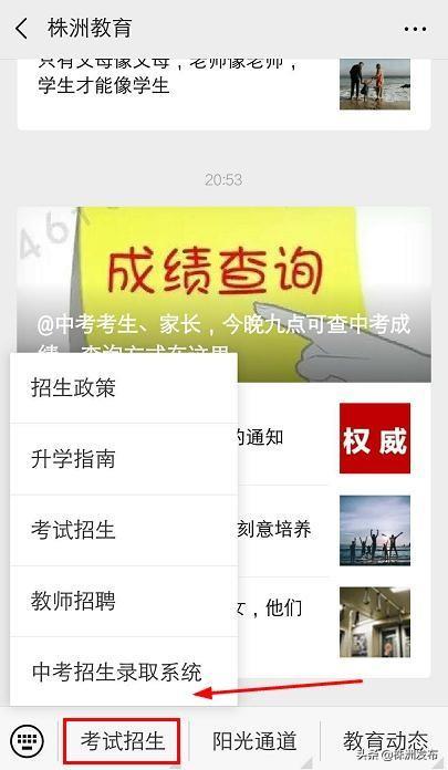 学生和家长可通过“株洲教育”查成绩。第一步:请学生或家长先关注微信公众号“株洲教育”,点击左下角的“考试招生”;或者用电脑上网百度查询“株洲教育”。进入“2019年株洲市普通高中与中等职业教育招生志愿填报与录取系统”,输入学生的用户名和密码即可以查询到成绩。