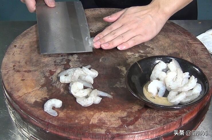 2、下面把解冻的虾仁捞出来,这个虾仁是青虾仁,是已经去过虾线的,再用刀把虾仁背部在划一刀,划刀是让虾仁预热翻卷,显得虾仁更大,更美观,也容易入味,把原料准备好之后开始上火。