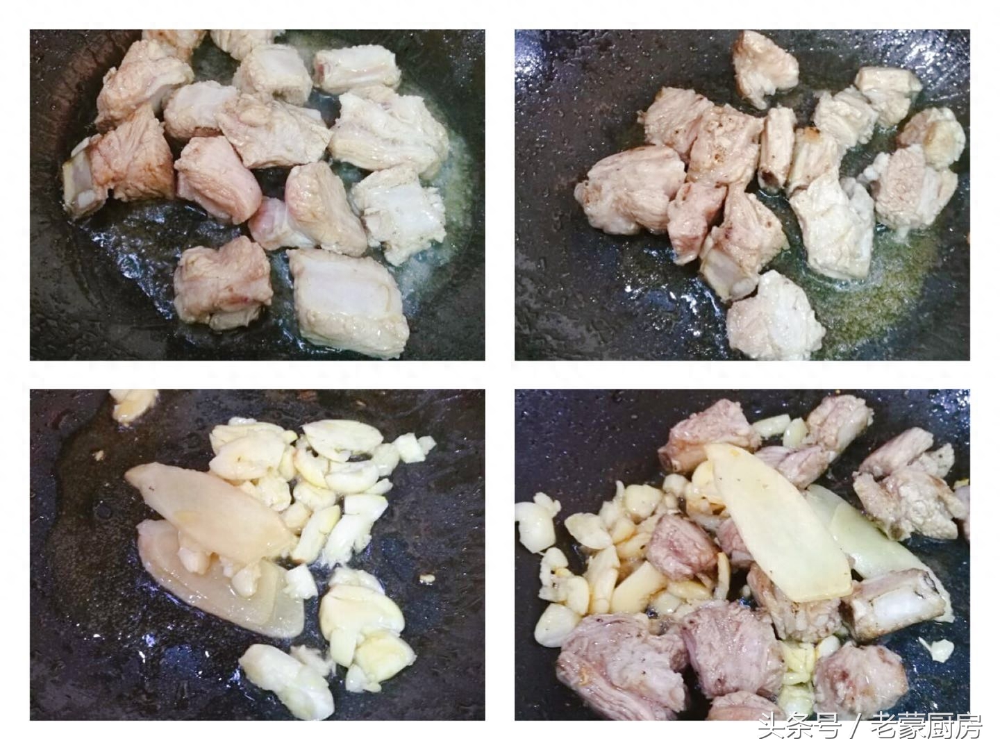 5、用锅中底油,放入姜片和蒜,煸炒出香味来,放入肋排继续炒香;