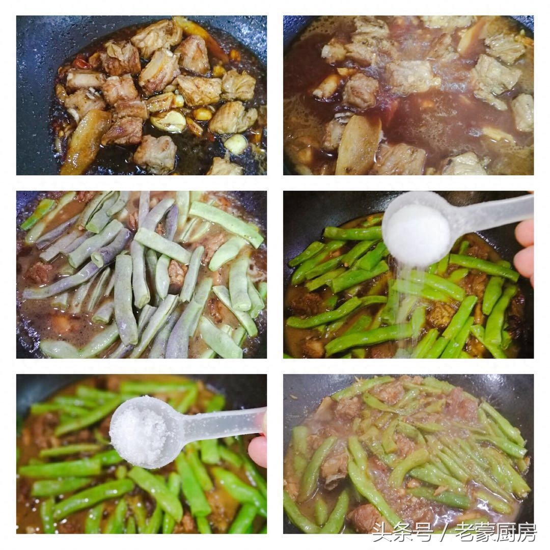 7、肋排上已经裹满料汁,倒入温水(水量大一些),盖锅盖烧开,放入豆角,翻炒几下,放入盐、糖;