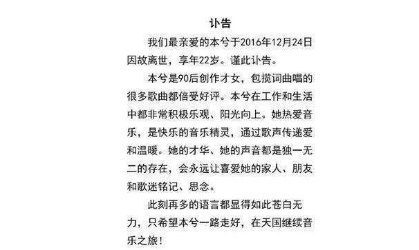 2016年12月27日,本兮经纪公司发表讣告,90后创作女歌手本兮于2016年a12月24日因故离世,年仅22岁。