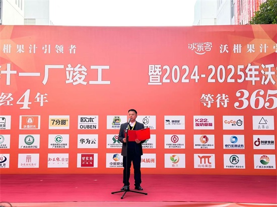 广西冰客食品有限公司董事长罗文彬在仪式上感谢合作伙伴的信任,对冰客公司的发展也有了更长远的目标。罗文彬表示,广西冰客食品有限公司获得多个行业第一的美誉,离不开“冰客人”的努力,以及众多合作伙伴的支持。未来将持续发挥企业的社会责任与担当,积极探索发展新质生产力,通过智能化、绿色化的生产方式,提升沃柑果汁的产品质量,做好“桂字号”特色农产品品牌,拉动区域经济发展,让沃柑产业走向世界。