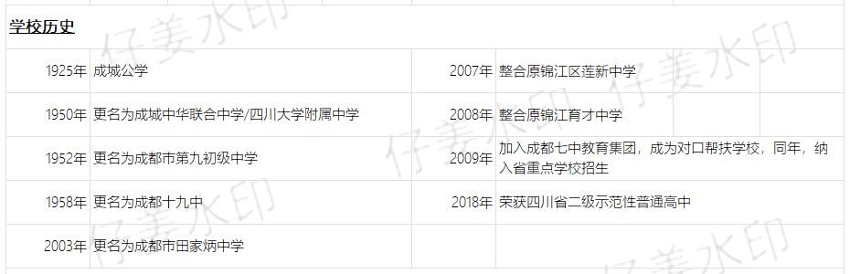 学校创建于1952年,建校时为成城公学,先后更名为成城中华联合中学、四川大学附属中学、成都市第九初级中学、成都十九中,2003年更名为田家炳中学,并先后整合了莲新中学、锦江育才中学后,形成了现有的一校两区的格局。于2009年成为成都七中的对口扶持学校,并于同年加入省重点学校招生。
