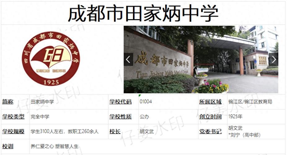 成都市田家炳中学简称田家炳中学,是一所由锦江区教育局管理的公办完全中学,现有学生规模约3100人左右,有初中部和高中部两个校区,占地约57亩,学校以“养仁爱之心 塑智慧人生”为校训。
