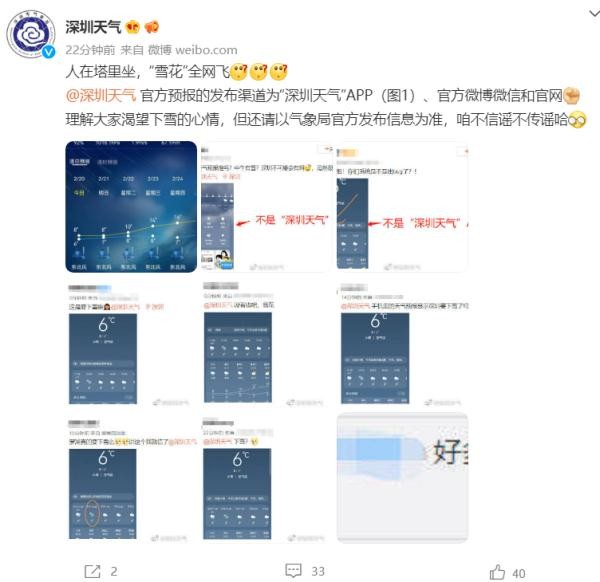 据@深圳天气紧急辟谣:“人在塔里坐,‘雪花’全网飞”。@深圳天气表示,理解大家渴望下雪的心情,但还请以气象局官方发布信息为准。
