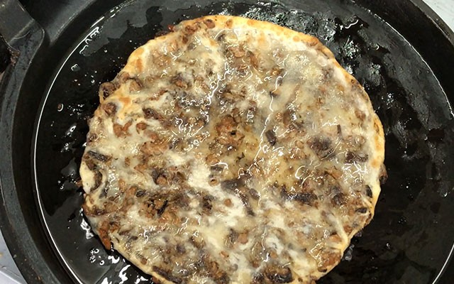 第七步:把电饼铛开最大火力,刷油后,把饼借助擀面杖放入锅中,大火烙至底面发黄后翻面,继续盖上盖子烙至两面都是金黄的,皮子脆脆的即可出锅。