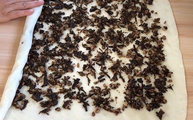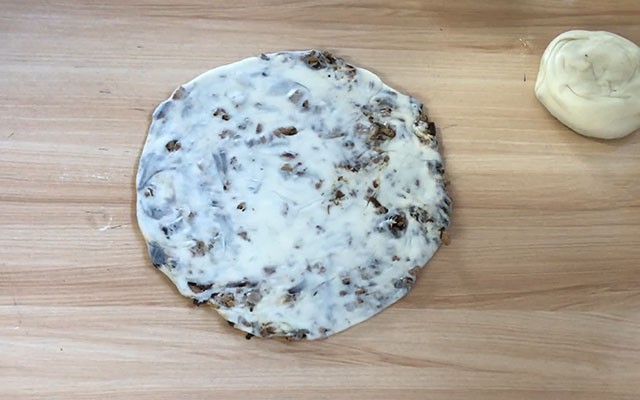 第五步:在案板上抹油,把面团取出来擀成大薄饼,然后把炒好的梅干菜肉丁平铺在上面,铺好后把饼卷紧,最后切剂子。