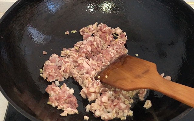 第三步:锅里加入多点的葱油,然后放入肉末,炒匀后加入少许花雕酒去腥,继续翻炒至肉完全变色,再加入适量蚝油、生抽、白糖调味。