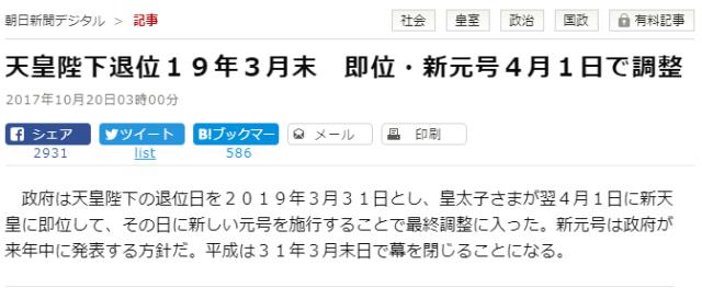 据日本朝日新闻报道,日本现任天皇将于2019年3月31日退位,而德仁皇太子也将于2019年4月1日即位下任天皇。