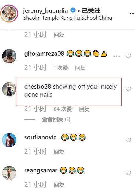 杰瑞米与一个小和尚学起了螳螂拳,但被网友评价为:”请不要炫耀你的指甲?“不知道上图与小和尚学习的动作是不是螳螂拳,大家有知道的可以在底下留言。