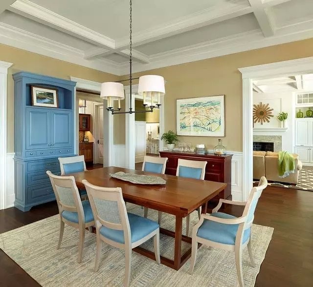餐厅以深木色饰面板为主,餐桌搭配蓝色纯白色靠背的餐桌椅,右侧蓝色收纳柜,特有小资情调。
