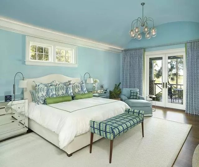 主卧采用蓝色背景墙设计,纯朴的白色床单搭配温润的木地板,让一切都变得很美好,推拉式门外面的阳台也别又一番景象。