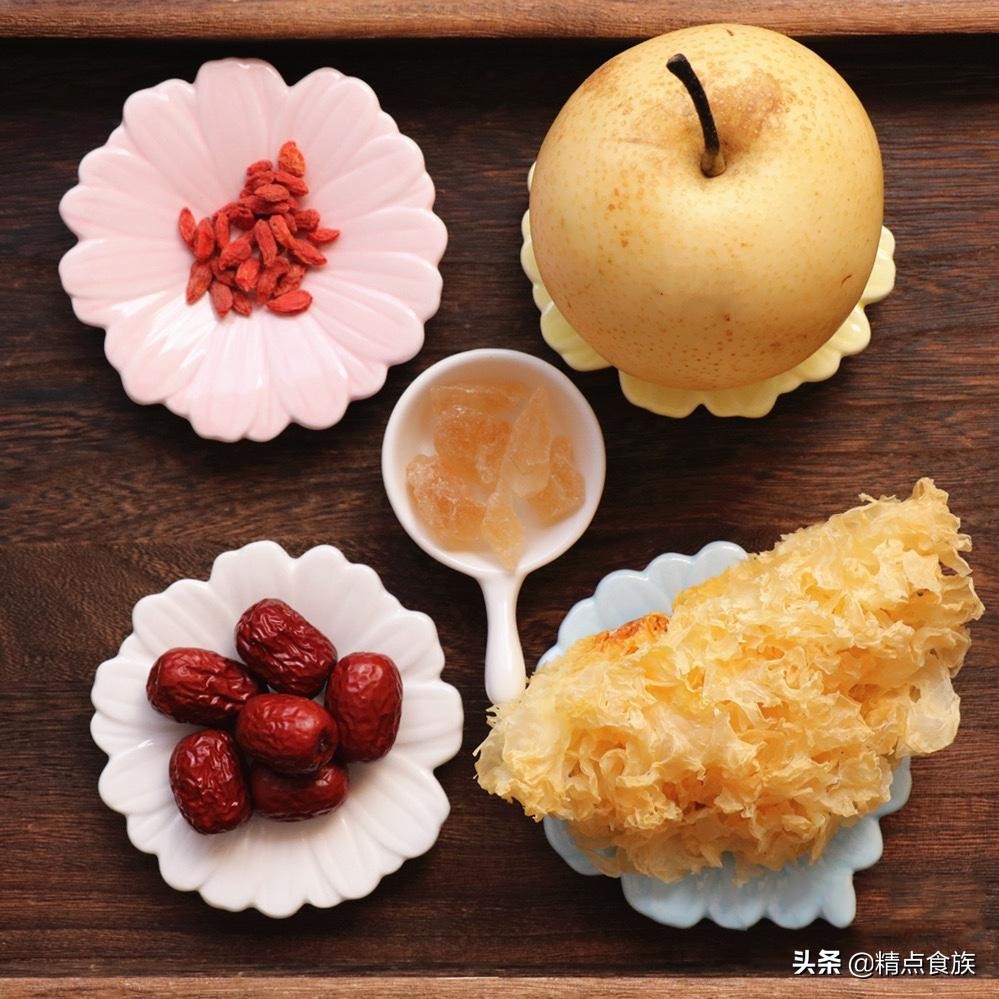 两至三人份所需食材银耳半朵、雪梨1个、红枣6颗、枸杞1小把、冰糖4小块。