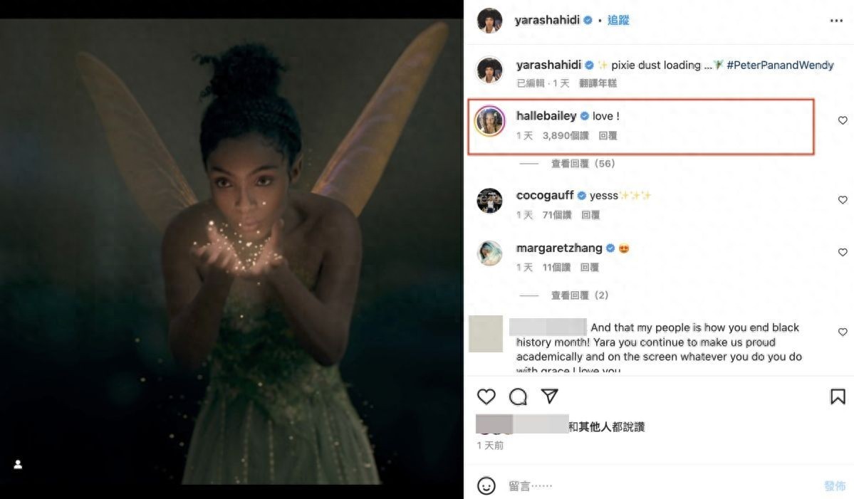 沙希迪的贴文引来许多网友赞赏,饰演真人版《小美人鱼》的非裔女星海莉贝莉(Halle Bailey)留言喊:「爱了!」其他粉丝则留言「我的小叮当是黑色的」「好漂亮」「你让我们感到骄傲」。一名粉丝预料黑人扮演白人动画人物可能会遭批评,讽刺说:「噢!嘘!美国又要崩溃了!」