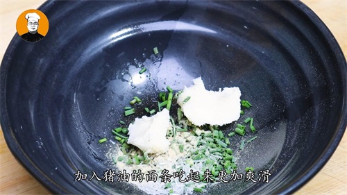 4、清汤面的料汁非常重要。碗中放入一勺食盐、几滴酱油,盐和酱油少不了,葱花是基本,再放入少许味精、胡椒粉增香,清汤面的灵魂是猪油。俗话说没有猪油的清汤面是耍流氓,加入猪油的面条吃起来更加爽滑