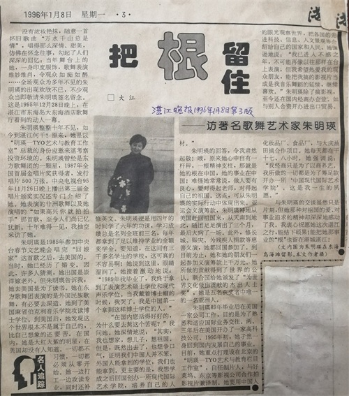 对于这首歌的喜欢,还体现在我的写作当中。记得在很多年以前,当东方歌舞团歌星朱明瑛由美国回国不久时我采访了她。我写她的专访就是用《把根留住》这首歌的歌名来作主标题的,副标题为:访著名歌舞艺术家朱明瑛。朱明瑛去美国留学及毕业后在美熟悉和适应国际业务工作十年,她没入美国国籍,没嫁给老外,学成(拿了博士学位)后回来报效祖国。她对祖国的赤诚感动了我,我在这专访的内文中有一段话这样写:“哦,原来她心中自有一杆秤,一根精神支柱,那就是她的根在中国,她的事业在中国!难怪她常常说,做人要有良心,要对得起老师,对得起自己的祖国。”朱明瑛她是这样说的,也是这样做的。亚运会义演筹款,修长城、赈灾、为残疾人捐款等慈善义演,她都回国参加了。她和她的朋友们一起参加义演筹款上千万元……她所做的贡献得到了世界的公认,联合国给她颁发了“为世界文化做出贡献的杰出人士奖”。