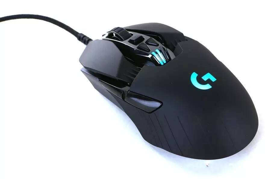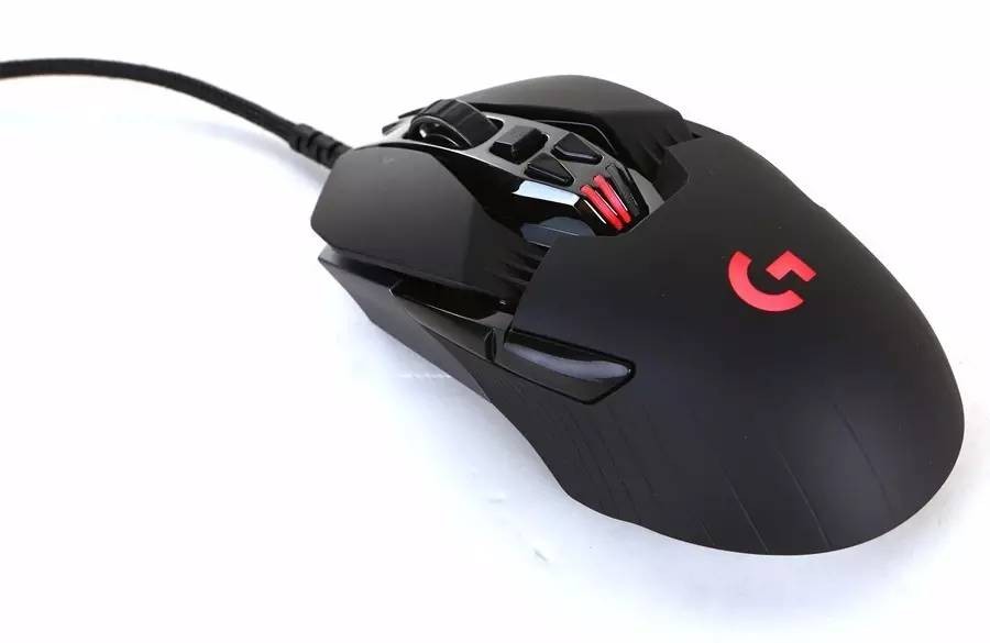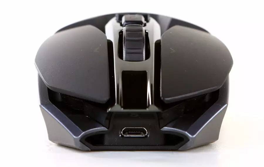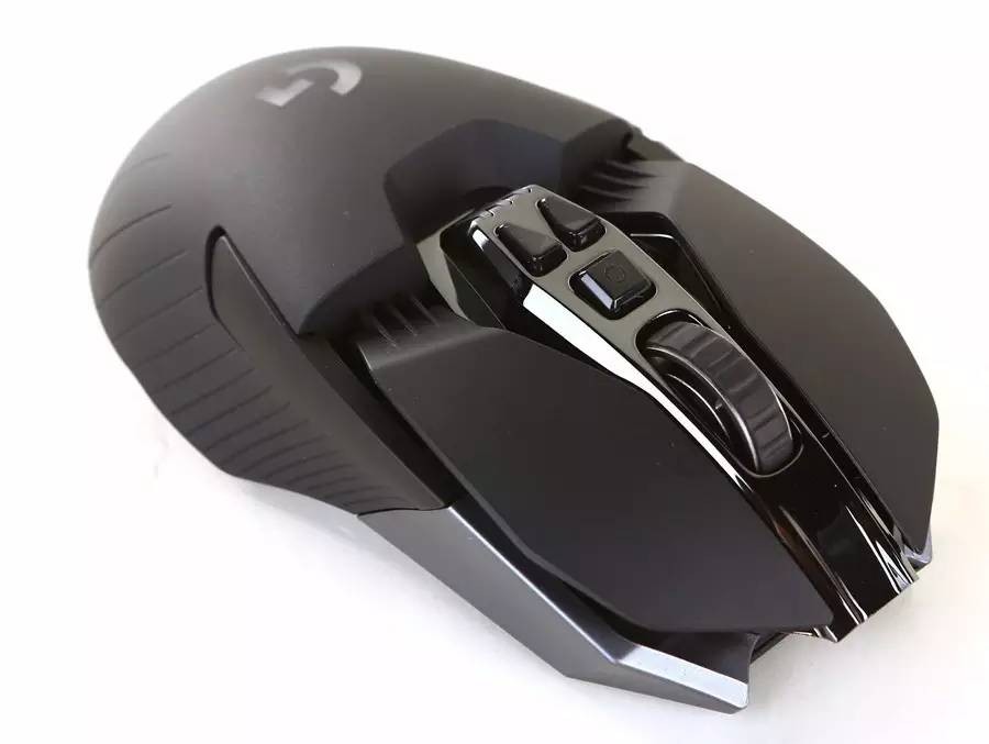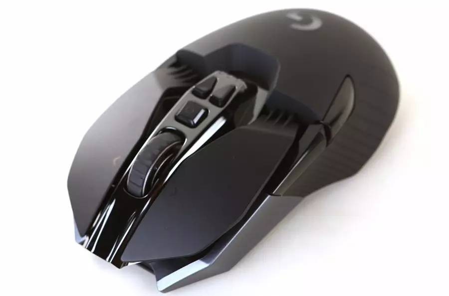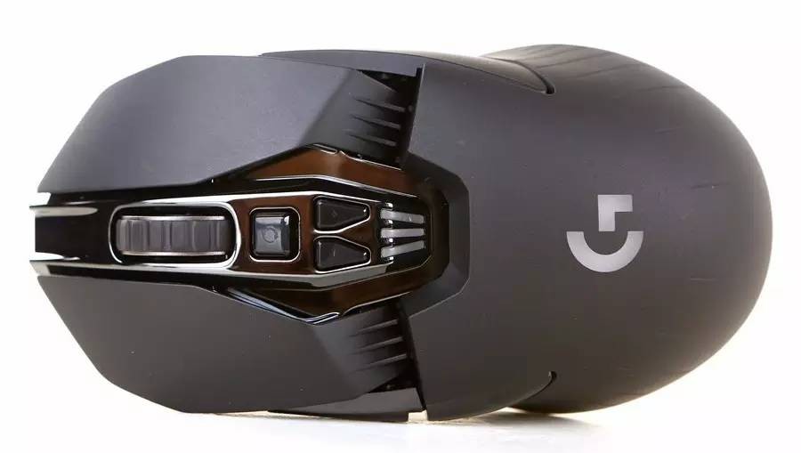 从顶部看,我们可以发现罗技G900的左右键采用了分离式按键,滚轮后方则是一个Micro-Gear滚轮模式切换按键和两个CPI档位切换按键;鼠标的后背处,乳白色的罗技背光Logo表明了它的身份。