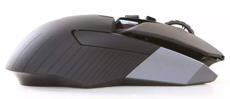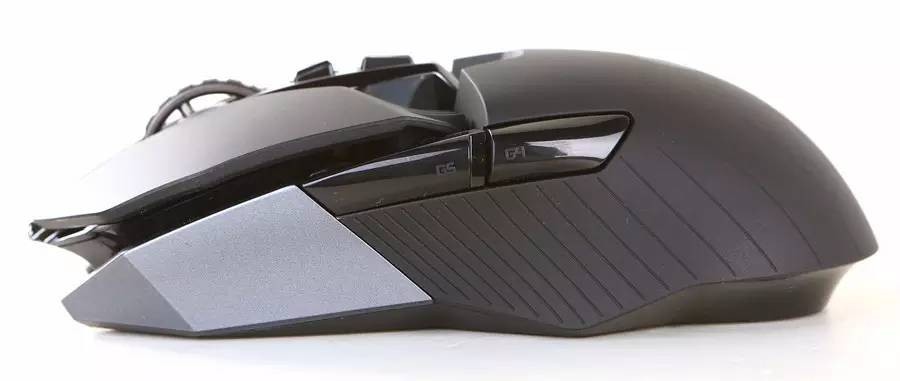 罗技G900的左侧前端采用了深灰色的类肤涂层材质;左上方放置了两颗常见的按键;侧裙中、后部分布着均匀的装饰线条,既可以加大摩擦力,又起到了美观的作用。