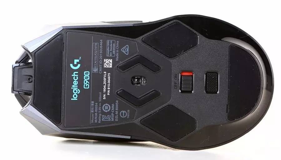 而罗技G900的底部则有6块特面积可观的氟龙脚贴;引擎孔的下方是鼠标无线开关,而开关的下方则是鼠标配置的切换按键。