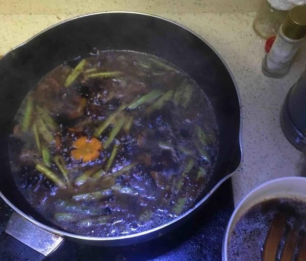 步骤 5.添热水:这步很重要!添入1.5大碗热水淹过菜,大火烧开后,留比平时水煮面少1\3的水量,其他倒出至碗里备用(加入焖面时水干了,可以把倒出的水倒入)