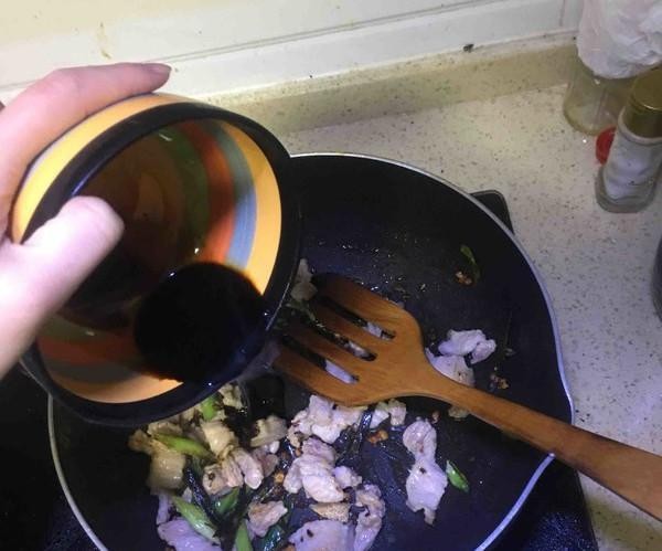 步骤 3.炒肉:肉片炸出肥油后,倒入1:5的生抽和老抽(用量可以慢慢加),再加入少许白砂糖,炒匀