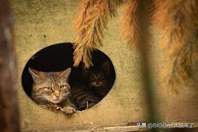 图:一只苏格兰野猫幼崽和母亲呆在猫舍中