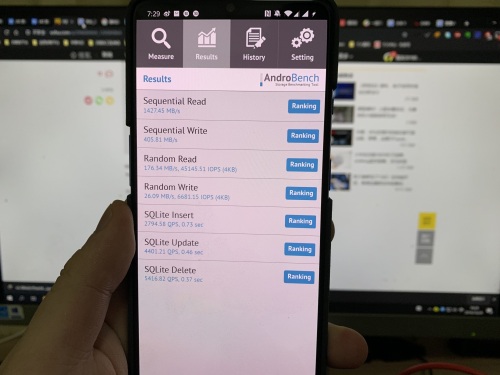 笔者手上这台是一加7T,搭载骁龙855 Plus和UFS3.0闪存,我跑分测试一下,UFS3.0闪存的顺序读取速度为1427MB/s,写入速度为405MB/s,4K随机读取速度为176MB/s,4K随机写入速度为26MB/s。可以得出一个结论,UFS3.0闪存在安装APP、加载大型游戏、传输大型文件的时候,对比UFS2.1有将近2倍的优势。