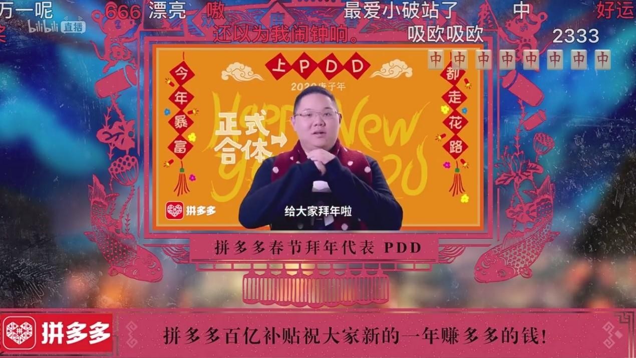 今年拜年祭,拼多多、王者荣耀、和平精英、蒙牛、哈尔滨啤酒成为主要广告主。在拜年祭播放期间,几位广告主以企业贺电的形式插入广告。PDD(英雄联盟电子竞技选手刘谋,因游戏ID为PDD而被直接叫做PDD)由于其名字与“拼多多”首字母一致而被调侃,此次代表拼多多拜年让B站用户直呼“nb”,王者荣耀男团祝用户新春开局顺利,蒙牛则是沿用其与《姜子牙》联动的动画片向B站用户拜年。