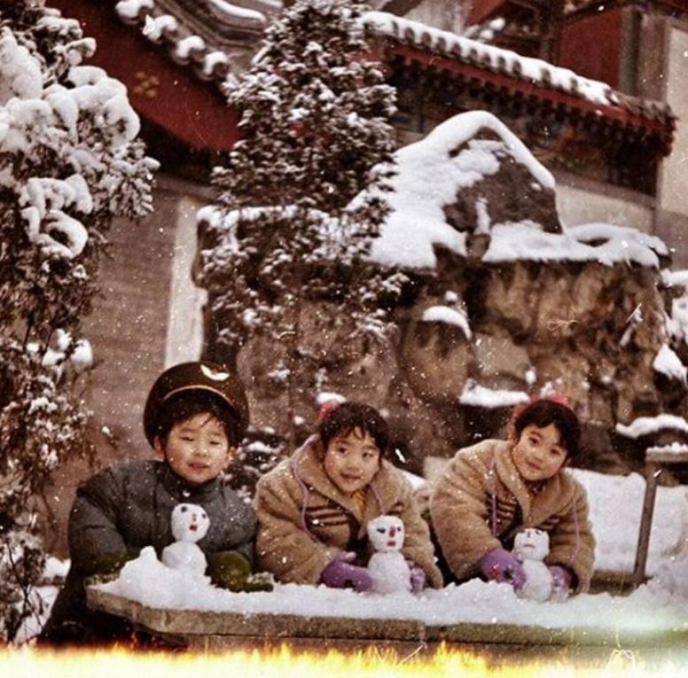 林淑华正在跟家中的女佣一起在雪地里堆雪人,穿着鲜红锦袄的少女笑脸也被冻得红彤彤的,雪地上一站煞是喜人。