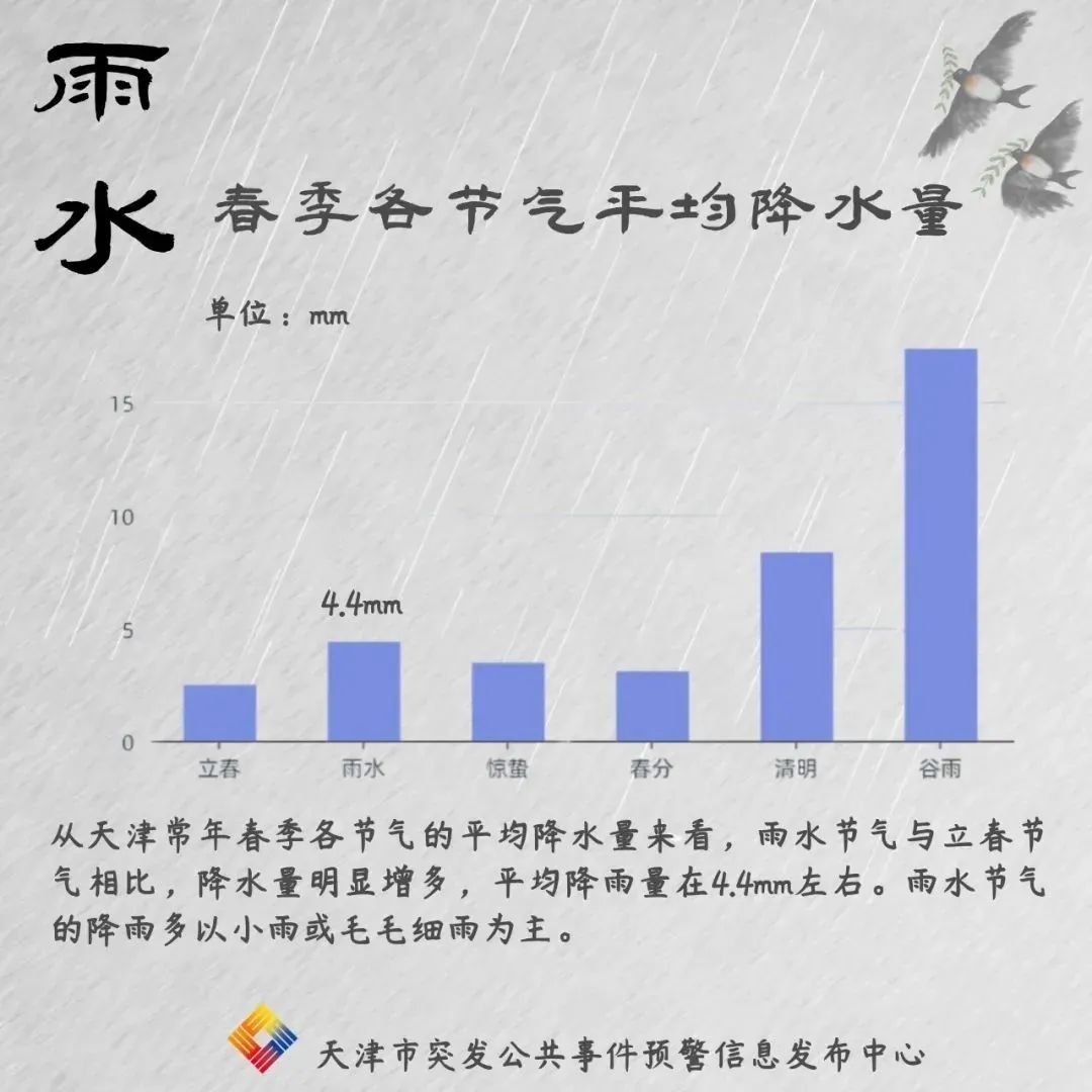 今天我们迎来了“雨水”节气,据天津气象消息,从天津常年春季各节气的平均降水量来看,雨水节气和立春节气相比降水量明显增多,平均降水量在4.4mm左右,降雨多以小雨或毛毛细雨为主。