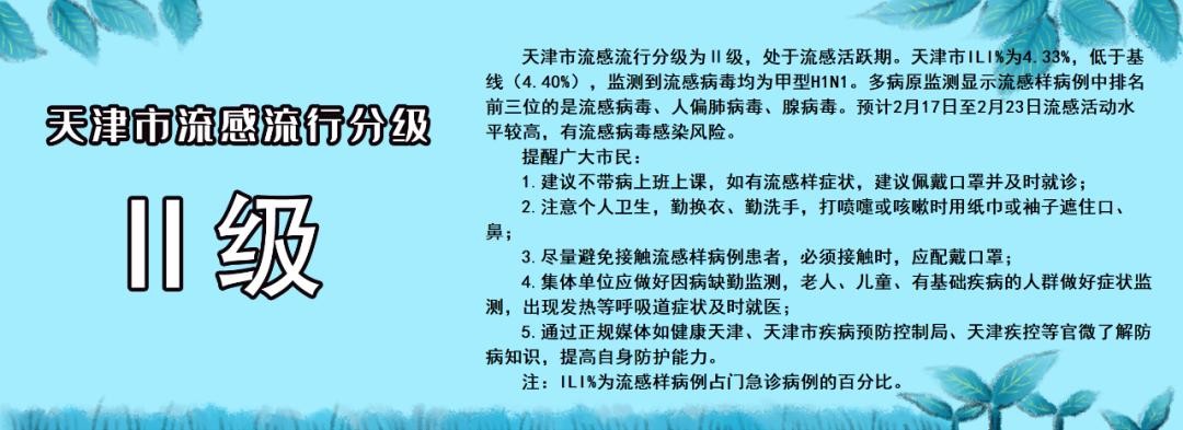 今日,“健康天津”微信公众号发布最新一期流感分级预警周报,天津市流感流行分级为Ⅱ级,处于流感活跃期。