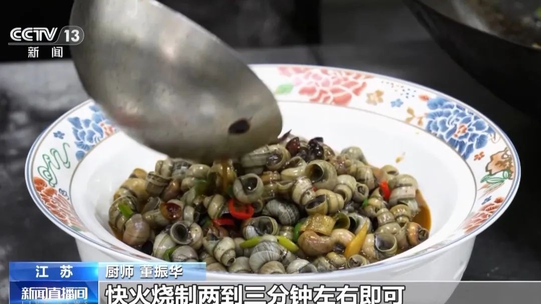 厨师 董振华:螺蛳的做法经过我们重新调整研发,先放点菜籽油、生姜、葱、小米辣在锅里爆香,倒入螺蛳炒一下,加入十六味秘制调料,快火烧制两到三分钟左右即可。
