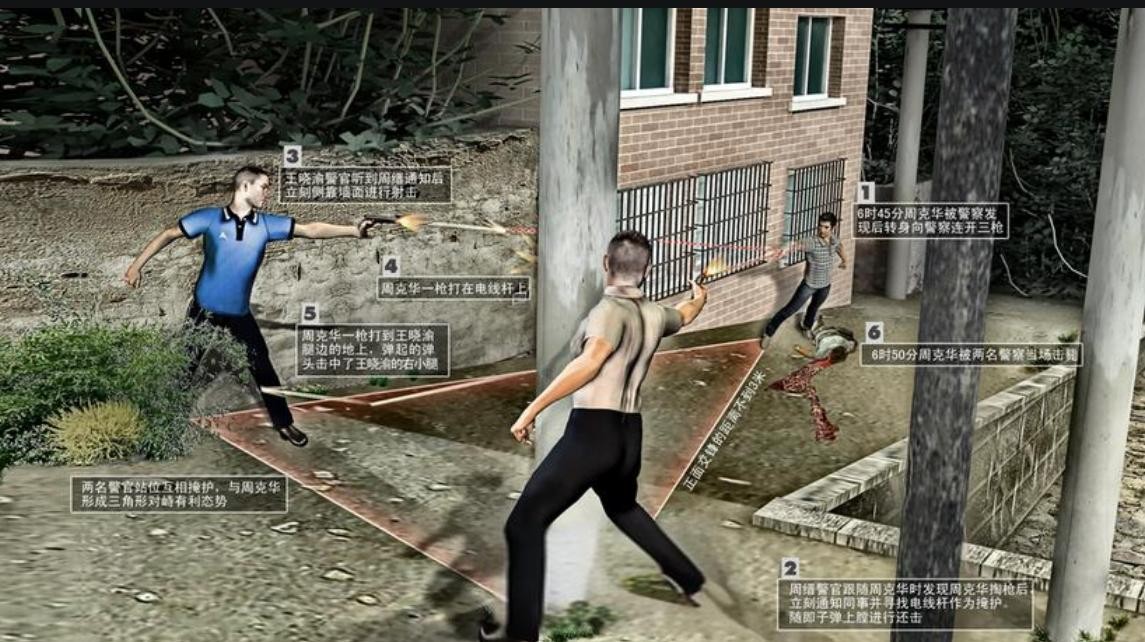 周克华警惕性相当高,见后面有人跟着,他走了一段后又马上返身往回走,在与两名便衣相距三米的位置时,周克华拔枪就打。