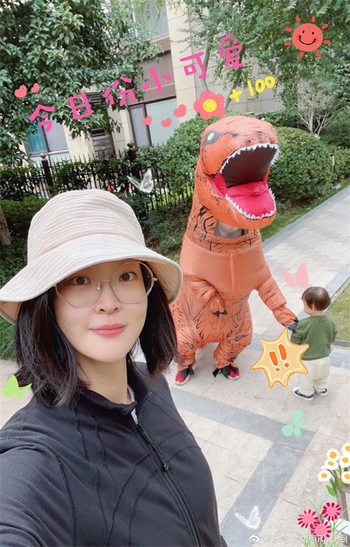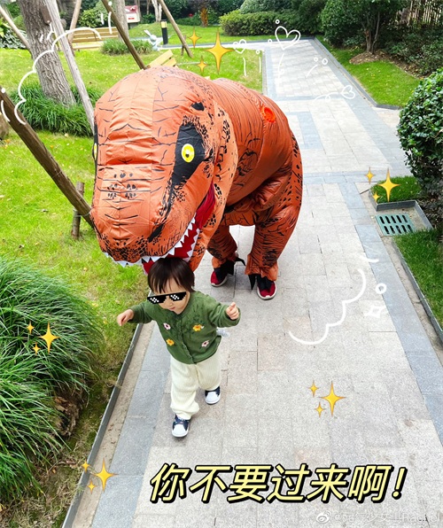 从照片中能看出,丈夫杨臻博为了哄女儿开心,扮演了一个恐龙。而他们一岁多的女儿显然已经会走路了。