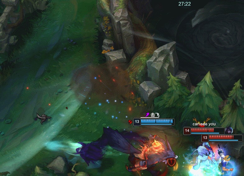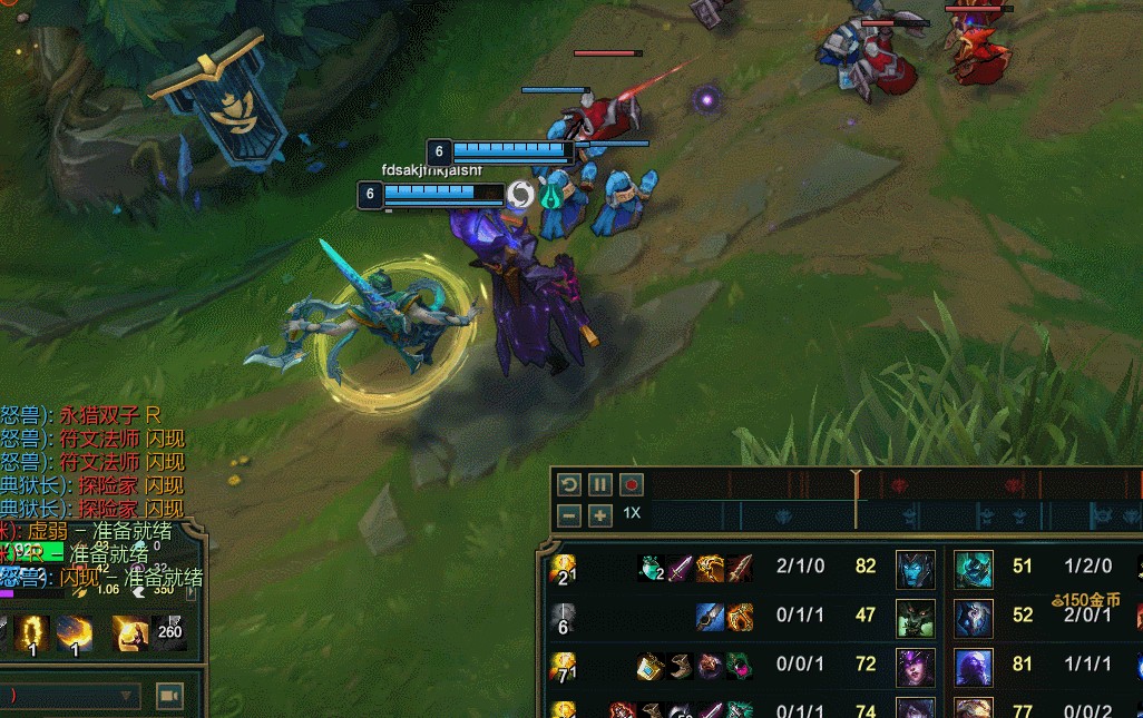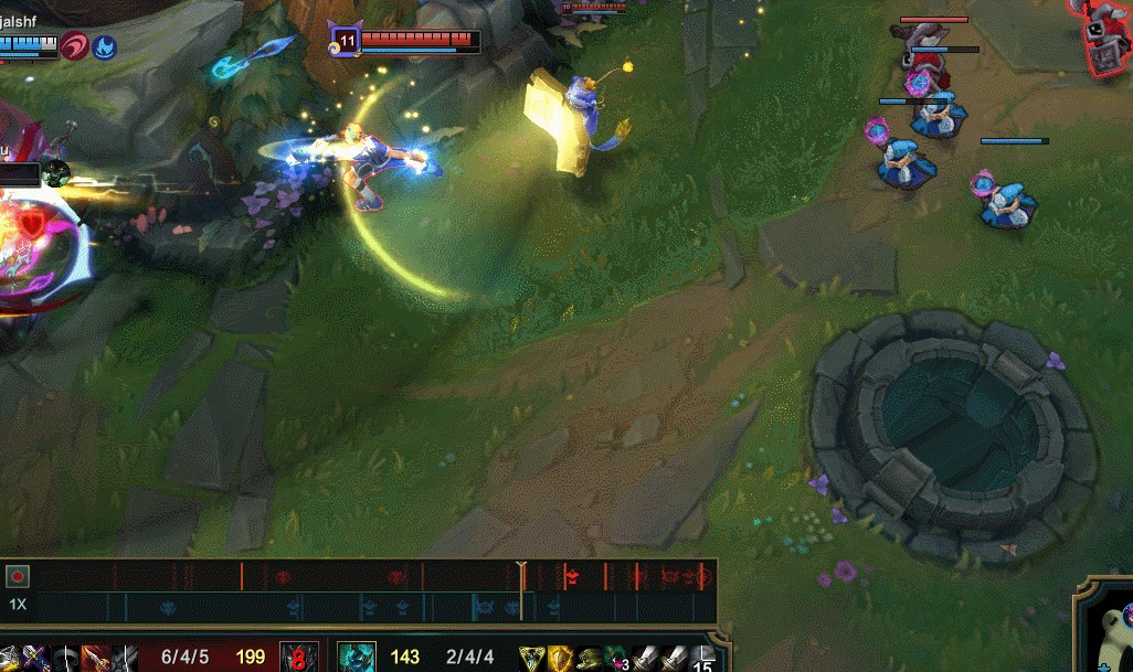 团战中,EZ如何选择自己的输出位置,在何时选择切入,何时选择撤退是一门很重要的学问。在这一波韩服高端EZ玩家的操作中我们可以非常清楚地看到他拉扯的操作,始终保持一个暧昧的位置,摇摆,风筝,始终保证自己在最舒服的位置上,而在需要爆发的时候立刻E上去打伤害,此后再马上拉回来,观察队友和对手的进一步节奏,在团战中保持这样的风筝节奏,能让EZ始终对对手产生威胁而又不给任何的机会。