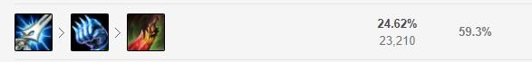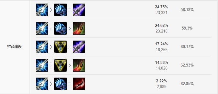 目前,主流的出装思路已经比较固定,EZ的机制注定要和魔切相绑定,而魔切之后,提升Poke和风筝能力的冰拳与提升全属性,注重伤害的三相一直是EZ的两条完全不同的路线,关于这两件装备的优劣,本文也会在后续的部分进行分析。目前的情况下,登场率更高的是冰拳,而我们在推荐出装中也可以发现死亡之舞已经上榜,作为一个登场时间较短的套路,这样的登场率和胜率数据足以证明这一套路的强势。