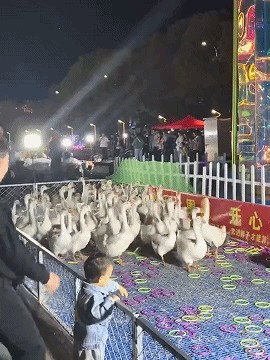老板内心:你们不可能套中的,这些鸭子我可是都训练过