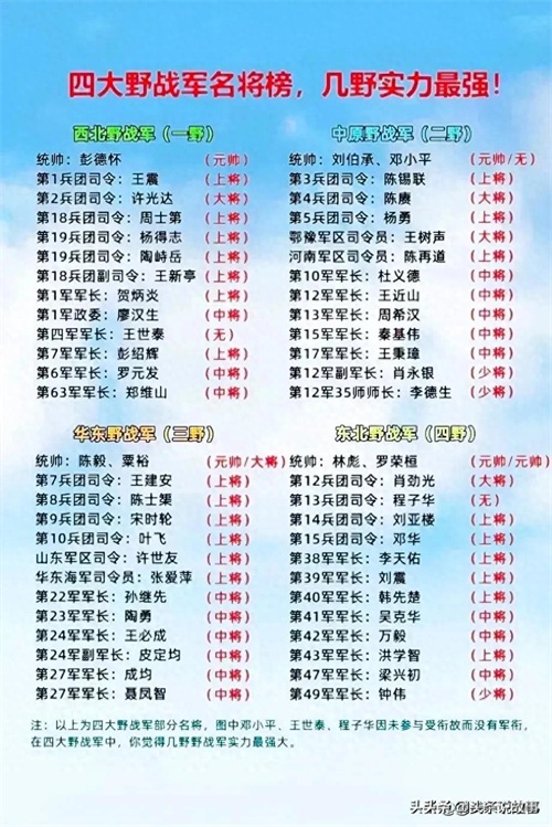 有人把“四大野战军”名将榜,收集整理好了,几野实力最强!