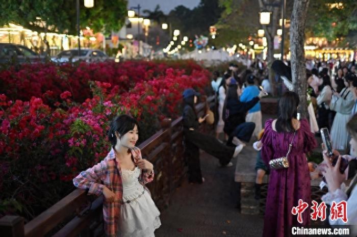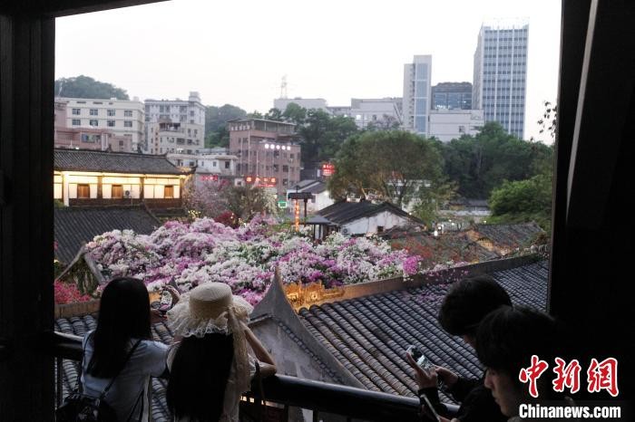 3月22日,广东深圳甘坑古镇勒杜鹃盛放,吸引游客拍照。甘坑古镇是“深圳十大客家古村落”之一,距今已有300多年的历史。中新社记者 陈楚红 摄