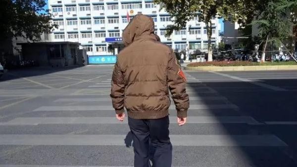 民警身穿一件棉衣,带上连体帽,从人行道下来向马路对面走去。下台阶后,扭头向右后方观察,但是虽然头转向了右边,但是连衣帽却没有跟着头部转动,左眼视线全被帽子挡住,右眼视线大部分也被挡住,险些被电动车撞到。