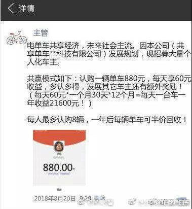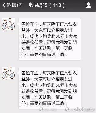“共享经济,大势所趋,不要再当井底之蛙了!认购共享单车一本万利,躺着赚钱!”近来,“共享单车”认购的噱头在朋友圈疯传,全国已出现多例骗局。骗子首先在网上散布诈骗广告,再以“认购一辆880元,每天返利60元,拉人头再奖励80元”的规则等待受害者上钩。受害者付完钱,就被踢出群拉黑。