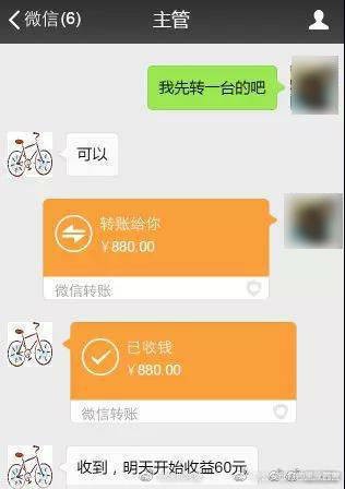 小王是一名上班族,除了上班,他还利用业余时间挣外快。不久前,小王在刷朋友圈时看到一则共享单车投资入伙的广告。眼见收益不错,心动的小王便主动加了该“主管”的微信。随后,小王被拉入一个单车合伙群,并转账880元认购了一辆单车,第二天开始可每天领取60元的返利收益。初尝甜头后,小王大胆地追购了7辆单车,没想到刚转完账,小王就被“主管”拉黑并踢出了群。