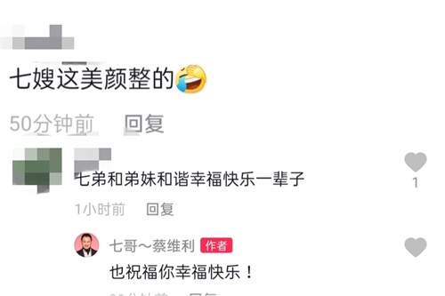 两个人同框的画面也受到了不少网友的祝福,有网友表示“七弟和弟妹和谐幸福快乐一辈子”,还得到了蔡维利本人的回复,不过也有网友调侃视频美颜太夸张。