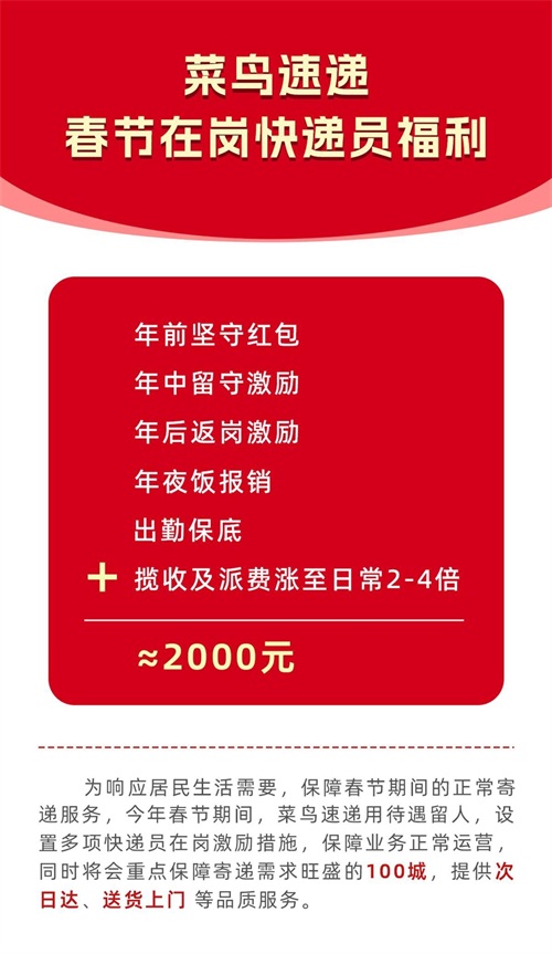 记者了解到,为了响应居民生活需要,保障春节期间的正常寄递服务,今年春节期间,菜鸟速递通过各项激励政策,用待遇留人,确保自营快递网络的正常运营,并在全国百城提供次日达、送货上门等品质服务。据悉,根据测算,春节在岗值守的运输司机、快递员等可享受年夜饭报销,各项福利举措人均额外增收2000元左右。