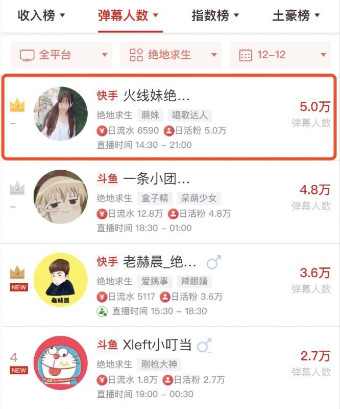 这两个主播已经是绝地求生的大主播,但是最近一个名为火线妹的快手绝地求生主播爆火,比这两位还厉害。直播统计平台给到的数据可以看到无论是弹幕量还是人数,火线妹都超过了小叮当和小团团。那火线妹到底是何方神圣呢?