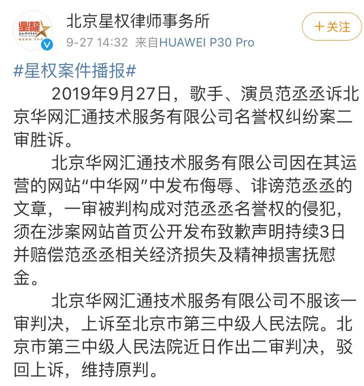 该微博称:2019年9月27日,歌手、演员范丞丞诉北京华网汇通技术服务有限公司名誉权纠纷案二审胜诉。北京华网汇通技术服务有限公司因在其运营的网站“中华网”中发布侮辱、诽谤范丞丞的文章,一审被判构成对范丞丞名誉权的侵犯。但被告不服一审判决,上诉至北京市第三中级人民法院。法院近日作出二审判决,驳回上诉,维持原判。