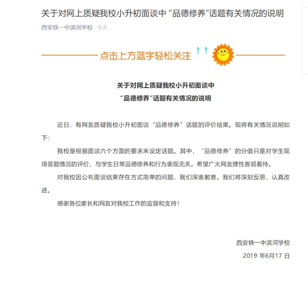近日,有网友质疑西安铁一中滨河学校小升初面谈“品德修养”话题的评价结果。今晚,西安铁一中滨河学校作出回应,说明如下: