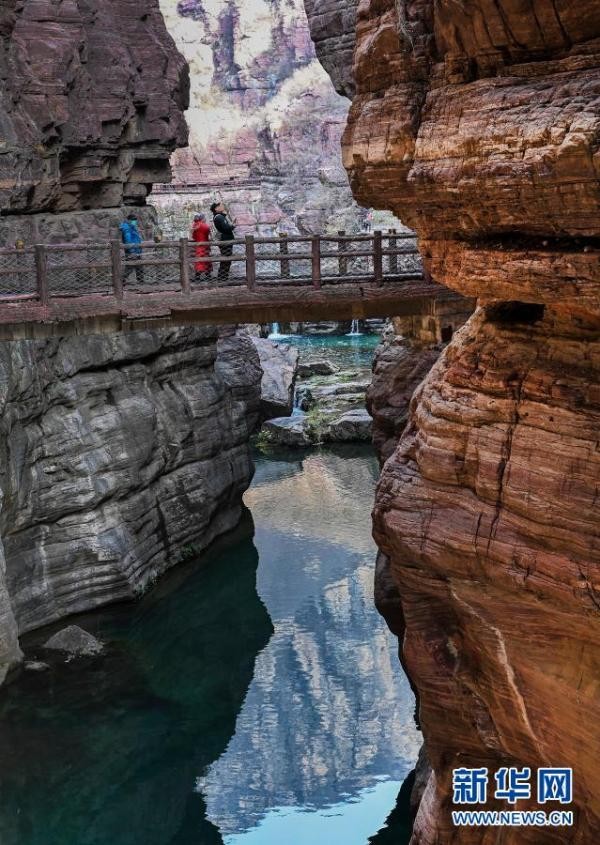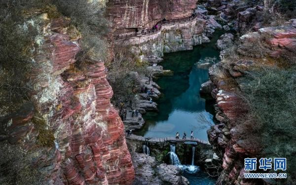 12月12日,游人在云台山风景区红石峡峡谷里游览。